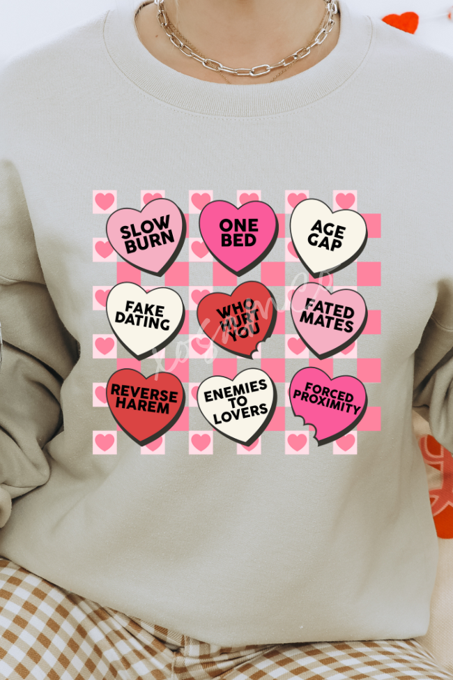 This Romance Tropes Candy Heart Graphic Sweatshirt is the perfect cozy addition to any romance reader's wardrobe. Made with soft fleece material, it's perfect for snuggling up with a good book and a cup of tea. Show off your love for romance with this Valentine's Sweatshirt.